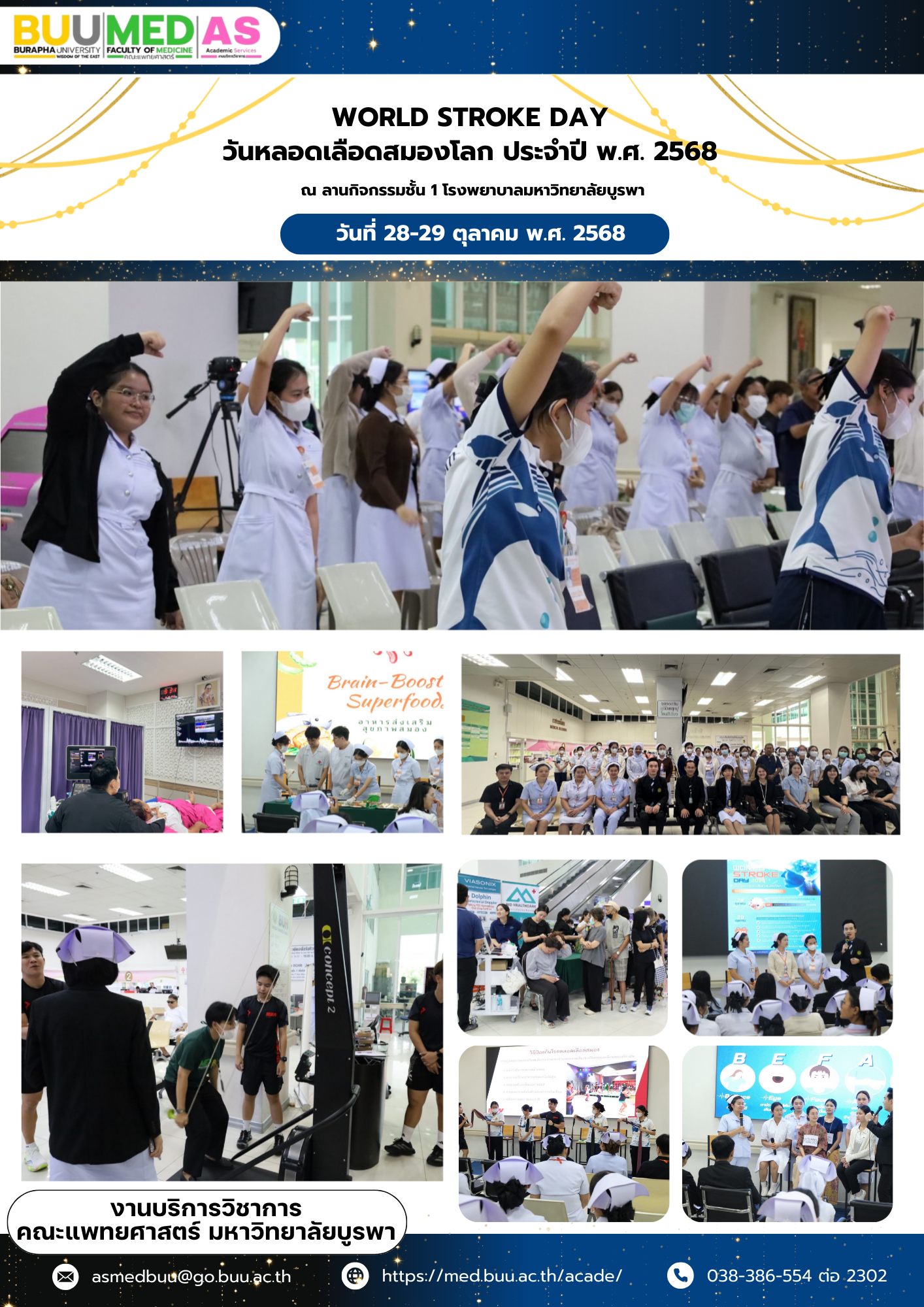 ด้วยภาควิชาอายุรศาสตร์ ร่วมกับคณะพยาบาลศาสตร์ และงานบริการวิชาการ ได้ดำเนินจัดโครงการ เรื่อง วันหลอดเลือดสมองโลก ประจำปี พ.ศ. 2568 (World Stroke Day 2025) วันที่ 28 – 29 ตุลาคม พ.ศ. 2568 โดยได้รับเกียรติจาก นายแพทย์ออมทรัพย์ พิกุลณี ผู้อำนวยการโรงพยาบาลมหาวิทยาลัยบูรพา กล่าวเปิดงาน ทั้งนี้ในงานมีกิจกรรมกายออกกำลังกาย การเข้ากิจกรรมเพื่อรับการตรวจคัดกรองการไหลเวียนของหลอดเลือดแดงใหญ่ และการเสวนาแลกเปลี่ยนความรู้ร่วมกับคณะพยาบาลศาสตร์ ณ ลานกิจกรรม ชั้น 1 โรงพยาบาลมหาวิทยาลัยบูรพา